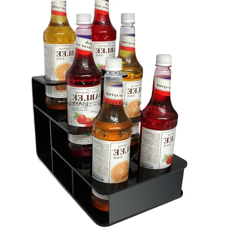 Keep your coffee station or bar area neat and efficient with this Syrup Bottle Holder and Organizer, crafted from durable black polystyrene. Designed to hold up to nine standard-size syrup bottles, this tiered organizer allows for easy access and clear visibility of flavors during service.